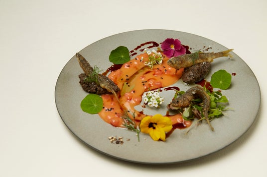 稚鮎のフリット、鮎のパテを珍しいスイカのソースとアクセントに熟成バルサミコでお召し上がりください。