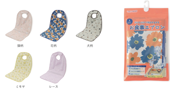 5種類のデザインを展開いたします。介護パジャマ同様、これまであまり介護アイテムにはなかった花柄や動物柄、レースなど、豊富なラインナップを取り揃えています。またテーブルクロスのように机に敷きながら使用できるほか、首元には調整可能な面ファスナーが付いているため、食べこぼしを防ぐことができます。そのほか撥水加工の施しや家庭用乾燥機での使用可能など、利便性とデザイン性に特化した介護アイテムです。