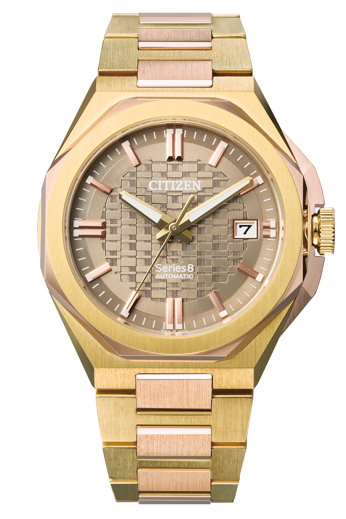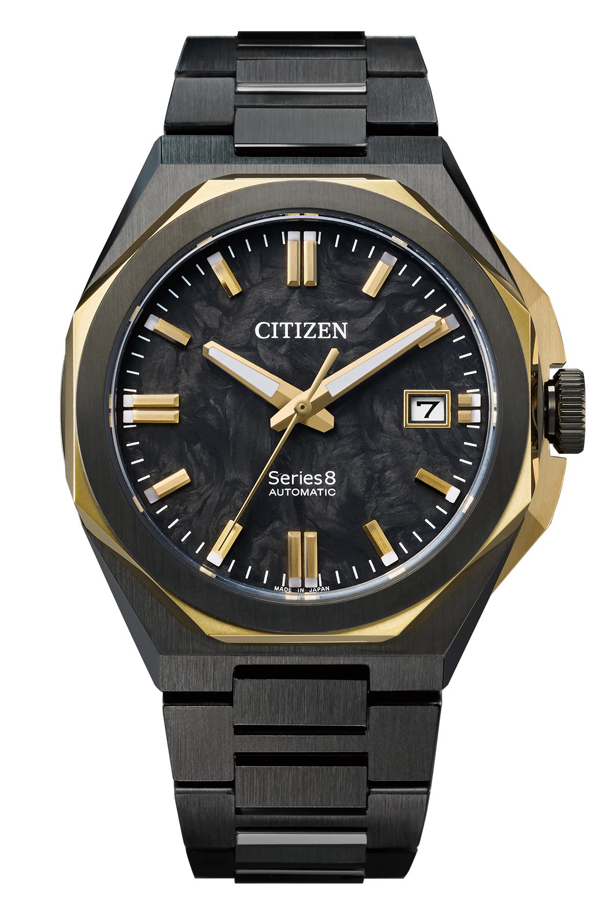 トレンドに合ったデザイン・サイズ・フィット感を追及した薄型機械式ムーブメントCal.9051搭載の新モデルが登場。薄型のケースでありながら丁寧に磨き上げられた5つのパーツで構成、シャープでエッジの立ったデザインはシリーズエイトのコンセプトを表現しています。文字板の中央セクター部分にはオリジナルパターンを採用、インデックスデザインは形状にこだわり、洗練されたデザインながらも全体にエレガントさを印象づけるモデルに仕上げました。また、限定モデルはグレーカラーにゴールドカラーをアクセントとし、文字板は航空機や高性能なスポーツカーにも用いられる軽量で強靭なカーボンを採用。シリーズエイトの無限の可能性を表現しています。