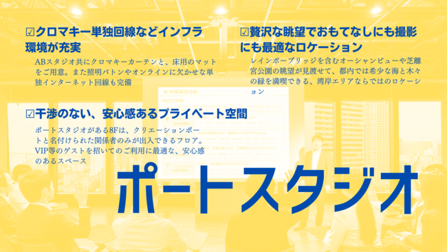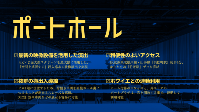 1階には壁一面のスクリーンで大迫力の映像演出を実現するイベントホール「ポートホール」が、8階には撮影や収録が可能な多目的スタジオ「ポートスタジオ」が完成しました。