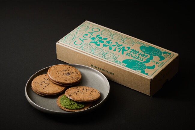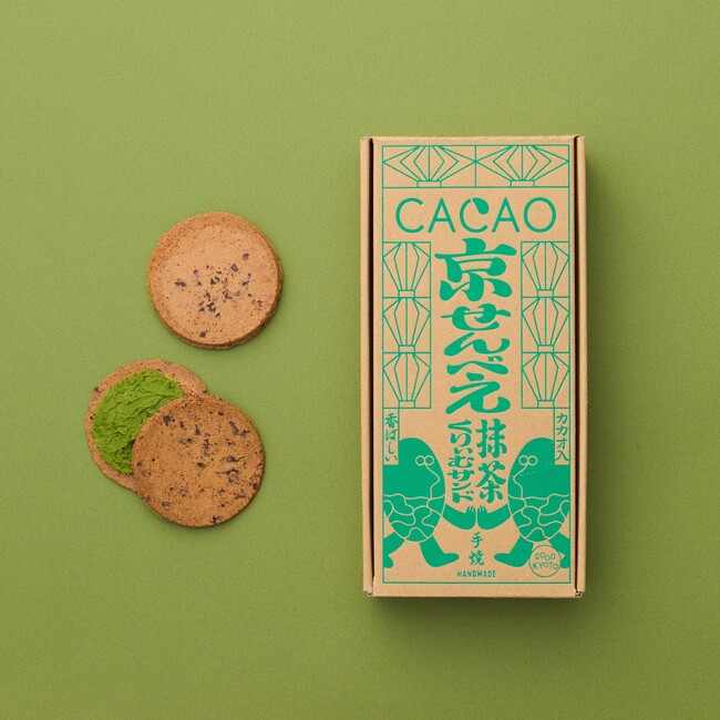 今回、2022年10月の発売から7か月で累計販売個数2,500箱を突破した人気商品「カカオ京せんべえ」がさらにグレードアップした、京都土産にもぴったりな「カカオ京せんべえ 抹茶くりぃむサンド」を限定発売します。