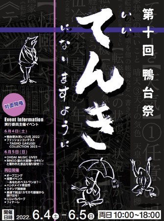 今年度で10回目を迎える鴨台祭は毎年11月に開催していましたが、今年度より6月開催となる転機を迎えています。学生が企画・運営し、巣鴨の地域一体で盛り上がる巣鴨エリア最大規模の伝統あるイベントである鴨台祭は、2019年度、2020年度の2年間、コロナ禍の影響によりオンラインにて開催となり、日常生活は一変しました。こうした先の見えない時間を過ごしてきた方々の日常や、対面形式再開となった鴨台祭に携わる皆様の辿る道は「いいてんき」であってほしいという想いが、テーマに込められています。