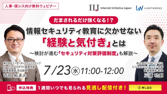 本ウェビナーでは、情報セキュリティの専門家であるインターネットイニシアティブ様をお招きし、「これは騙される!」をテーマに、これからの時代に求められる、「小さな経験の積み重ねによる気付き」を重要視した新しいセキュリティ教育のアプローチについてご紹介します。また、2026年10月の運用開始が予定されている、経済産業省による「セキュリティ対策評価制度」についても解説します。