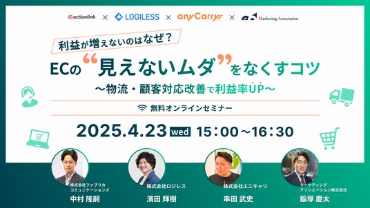 ラストマイル物流に特化した物流ソリューション事業を展開する株式会社エニキャリは、株式会社ロジレス、マーケティングアソシエーション株式会社、株式会社ファブリカコミュニケーションズと、2025年4月23日(水)に共催ウェビナー「利益が増えないのはなぜ?ECの“見えないムダ”をなくすコツ ~物流・顧客対応改善で利益率UP~」を開催します。
