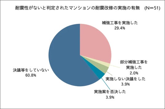 ・耐震診断で「耐震性がない」と判断された旧耐震基準マンション51組合のうち、補強工事もしくは部分補強工事を実施したのは31.4%(16組合)であった。