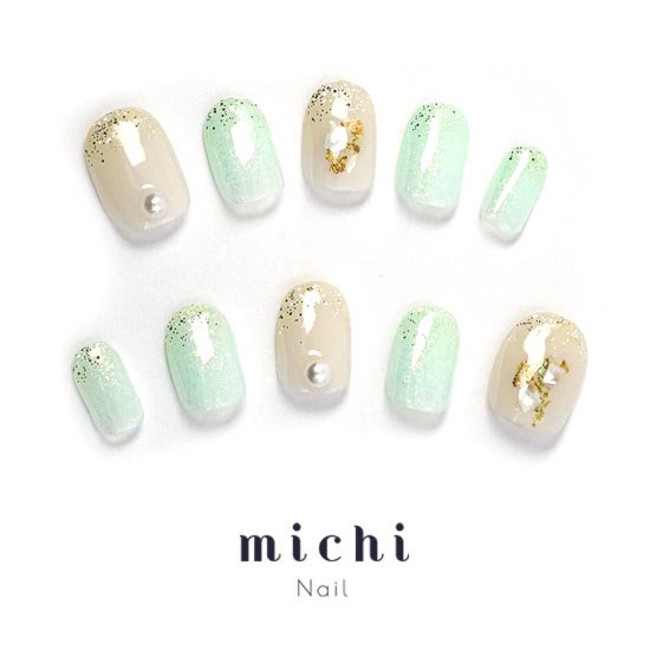 初夏を感じるさっぱりとしたミントカラーと肌なじみのいいベージュがマッチしたこちらのデザイン。大きめのパールとラメのグラデーションが綺麗なネイルです。金箔をたっぷり使っているのでゴージャスさも感じられます。シンプルなお洋服にもポイントになる、この時期おすすめのネイルです。