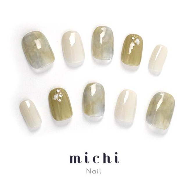 シアーなカーキカラーとマーブルアートが独特なこちらのネイル。透け感が天然石のようで、涼しげな印象です。薬指はさりげなくゴールドのグリッターとシェルで飾られています。シンプルなデザインで、クール系のファッションにもマッチします!