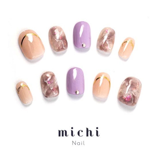 パステルパープルと天然石風アートがおしゃれなこちらのデザイン。肌なじみのいいカラーの中にパステルパープルが入り印象的な手元にみせてくれます。ベージュカラーの指先にはゴールドのフレンチラインで飾られていて、輝きも十分です!