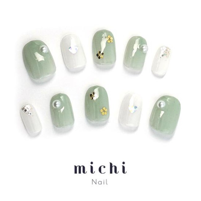 ■ホワイト×グリーンの春色ネイル