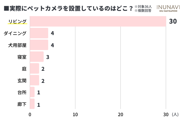 既にペットカメラを使用している飼い主さんの設置場所で最も多い回答も「リビング」30人でした。