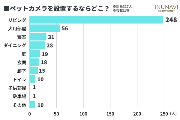 ペットカメラを設置するなら「リビング」と回答した飼い主さんが248人と最も多い結果になりました。