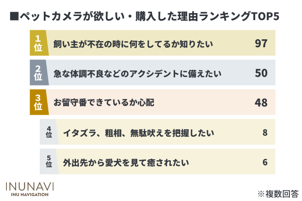 また、2位に「急な体調不良などのアクシデントに備えたい」50票が続き、留守中に愛犬に何かあったらいけないと心配する飼い主さんも少なくないことがうかがえます。