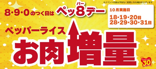 株式会社ホットパレット(本社:東京都江東区、代表取締役社長:松本純男)が展開するペッパーランチは、8、9、0のつく日を「ペッパーデー」としペッパーライスのお肉を増量して提供いたします。