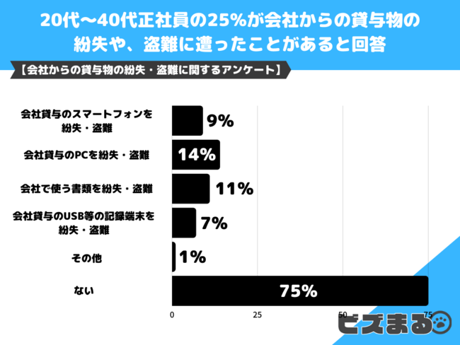 ■20代~40代正社員の25%が会社からの貸与物の紛失や、盗難に遭ったことがあると回答