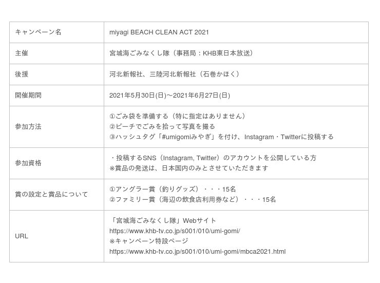 「宮城海ごみなくし隊」(事務局:KHB東日本放送)は、2021年5月30日~2021年6月27日に「miyagi BEACH CLEAN ACT 2021」を開催しました。本キャンペーンは、日本財団が推進する海洋ごみ対策プロジェクト「海と日本プロジェクト・CHANGE FOR THE BLUE」の一環で開催したものです。