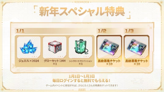 ■ NIKKEからのお年玉としてゲームにログインするだけでもらえる超豪華なアイテム詰め合わせプレゼントを3日間連続配布!