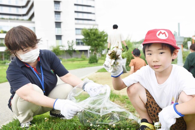 当日、子どもや大人、公園の周辺事業者などが参加し、ごみ拾いや芝生エリアの草引き、せせらぎ水路の清掃などを行った。