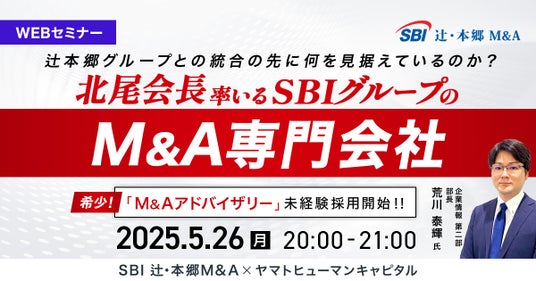 ヤマトヒューマンキャピタル株式会社(本社:東京都千代田区、代表取締役:堀江 大介)は、2025年5月26日(月) 20:00よりオンラインにて、SBI 辻・本郷M&A株式会社の荒川氏、土橋氏、長谷川氏にご登壇いただくウェビナー『北尾会長率いるSBIグループのM&A専門会社。辻本郷グループの同業との統合の先に何を見据えているのか?』を開催いたします。