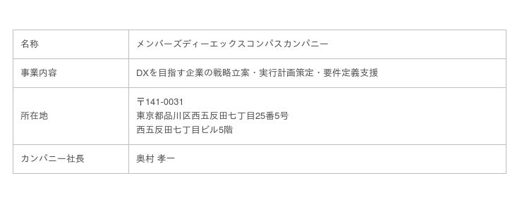 株式会社メンバーズ(本社:東京都中央区、代表取締役社長:剣持 忠、以下「メンバーズ」)は、2030年の目指す姿を示した「VISION2030」(※1)の達成に向け、国内大手企業に対するデジタルトランスフォーメーション(以下「DX」※2)推進支援の一環として、ビジネス要件の企画検討段階から支援する人材の派遣事業を行う社内カンパニー「メンバーズディーエックスコンパスカンパニー」(以下、「メンバーズDX Compassカンパニー」)を設立し、営業を開始しましたのでお知らせいたします。