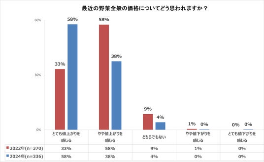 物価高が相次ぐなか野菜の価格について本年の結果では96%が「値上がりを感じる(とれも感じる やや感じる 合算値)」と回答しており、前回(2022年)から5ポイント増加しています。値上げの対策としては、「セール・特売の活用」「規格外の野菜を購入」「家庭菜園」「冷凍野菜の購入」などさまざまなアイデアがありました。