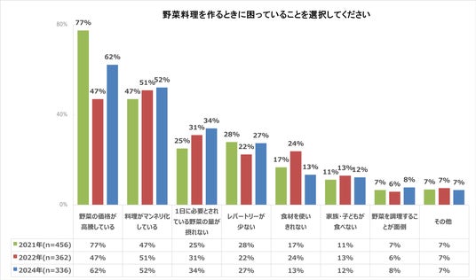 野菜料理で困っていることについて「価格の高騰」に次いで、「料理のマンネリ化」「レパートリーが少ない」といった調理に関することが上位になっています。また、「1日に必要とされている野菜の量が摂れない」=摂取不足を感じている方も年々増えてきています。