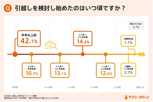 株式会社サマリーが運営する収納サービス「サマリーポケット」は、春の引越しシーズンに合わせて、直近3年以内に引越しをした全国の10代~60代の男女184名を対象に「引越しに関する調査」を実施しました。