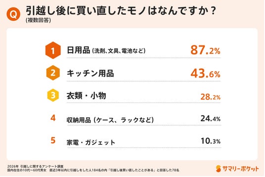 ・約4割が「引越し後に必要なモノが見つからず買い直し」経験あり(買い直し品は日用品が最多 87.2%)