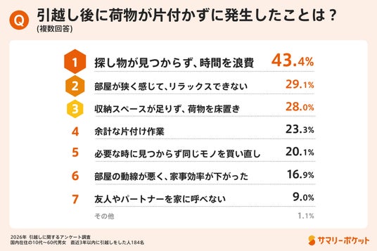 実際に、引越し後に整理できていない荷物があることで感じた困りごととして、「探し物が見つからず、時間を浪費した」が43.4%で最多でした。次いで、「部屋が狭く感じ、リラックスできない」(29.1%)、「収納スペースが足りず、床置きしている」(28.0%)、「余計な片付け作業が発生した」(23.3%)が続き、片付けの遅れが暮らしの快適性に影響していることがうかがえます。