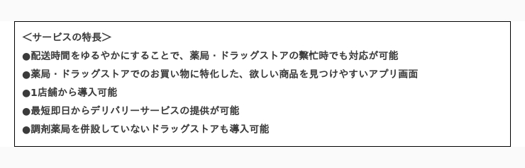 サービス内容 :薬局・ドラッグストア店舗におけるデリバリーサービス構築