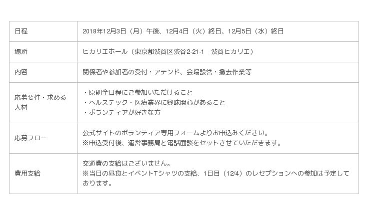 メドピア株式会社(東京都中央区、代表取締役社長 CEO:石見 陽)は、2018年12月4日(火)・5日(水)の2日間、ヘルステックのグローバルカンファレンス「Health 2.0 Asia - Japan 2018」(https://www.health2conjapan.com/)を、東京・渋谷ヒカリエホールにて開催いたします。2日間、ボランティアスタッフとして一緒にイベントを盛り上げてくれる方々を募集しています。