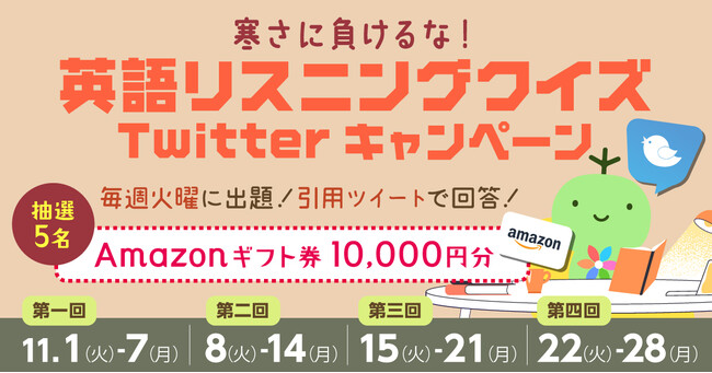 株式会社ポリグロッツ(本社:東京都新宿区、代表取締役:山口隼也)は、11月1日(月)~11月28日(月) まで英語リスニングクイズTwitterキャンペーンを開催いたします。クイズにご正解した方の中から抽選で、 Amazonギフト券1万円分を合計20名の方にプレゼントいたします。