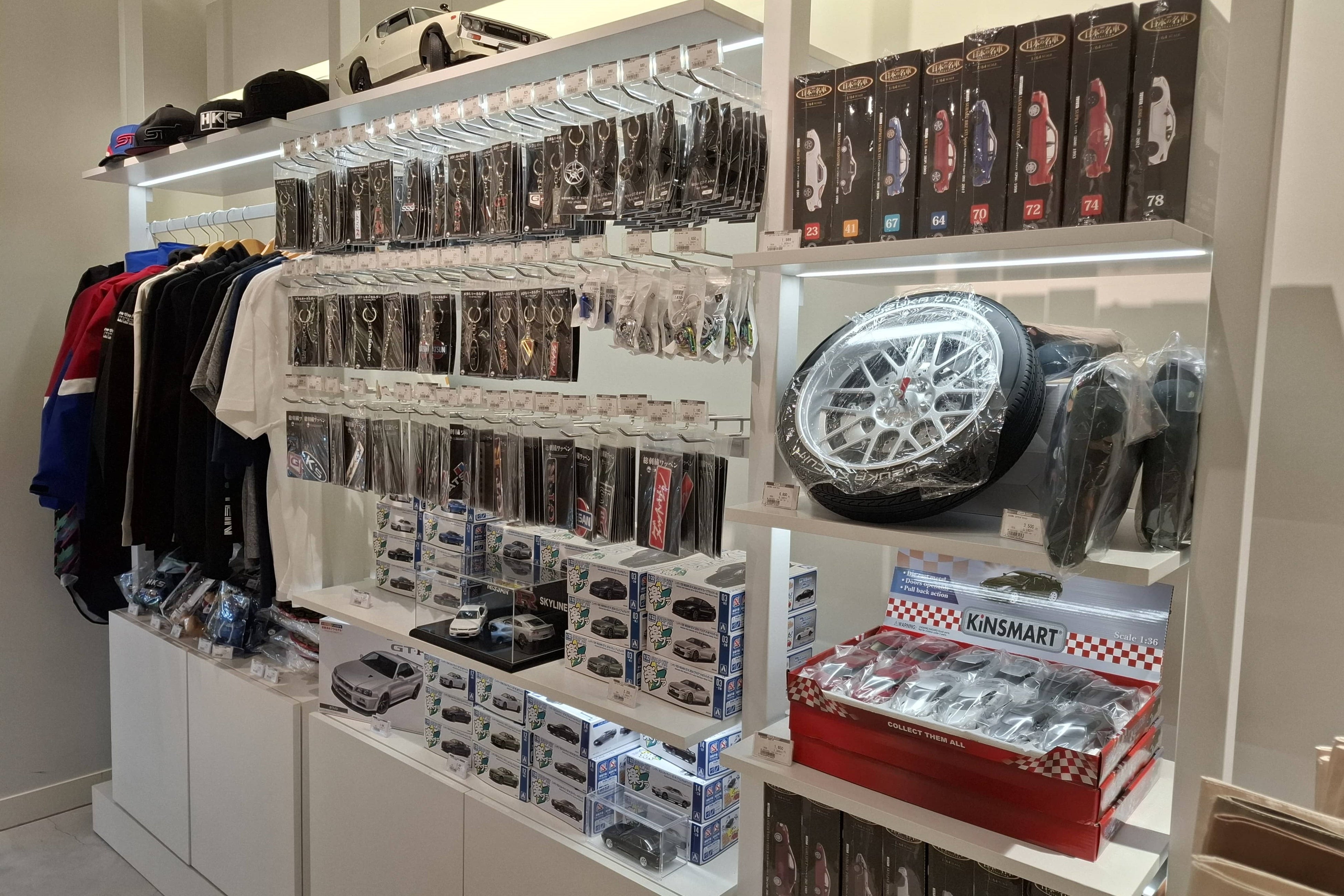 店内では、“ドリフトキング”こと土屋圭市氏のアパレルコレクションをはじめ、CIVICやRX-7などのCARデザインTシャツや、ユニークなHONDA×PANDIESTA JAPANアパレルなどを取りそろえています。また、海外でも人気の高い日本アニメのキャラクターをデザインに取り入れたアパレルやクルマに関連したアイテム、さまざまなミニカーをラインアップしています。免税対応店舗として、訪日外国人のお客様にも快適にお買い物いただける環境を整えています。