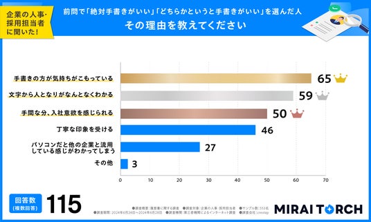 履歴書は手書き派の115人に「手書きの方がいい理由」ついて複数回答可で聞いてみたところ、1位は「気持ちがこもっている」でした。