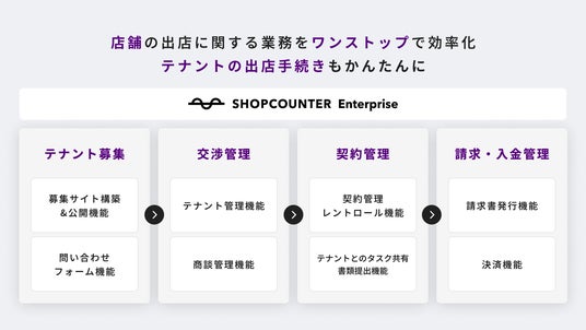 ショップカウンター エンタープライズは、商業施設とテナントとの新たなつながりを作り、理想的なリーシングフローを実現するクラウド型の業務支援システムです。テナントの募集から、商談管理、契約手続き、請求などリーシング業務に必要な機能をワンストップで提供。デジタル活用による業務効率化はもちろん、施設の収益性向上をサポートしています。