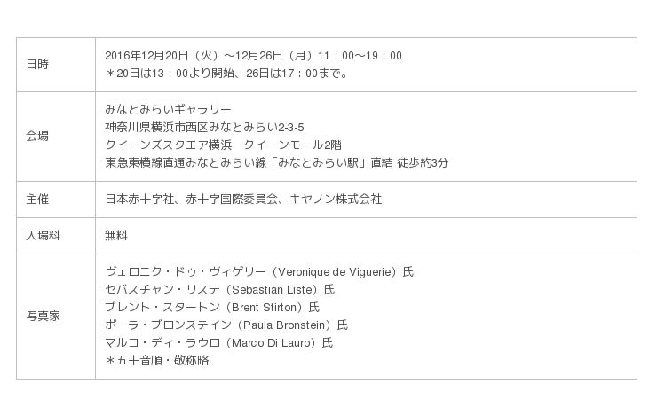 日本赤十字社、赤十字国際委員会(ICRC)、キヤノンの三者は、みなとみらいギャラリー(神奈川県横浜市)にて、国際人道法写真展「戦場を希望の大地へ」を2016年12月20日(火)から12月26日(月)まで開催します。
