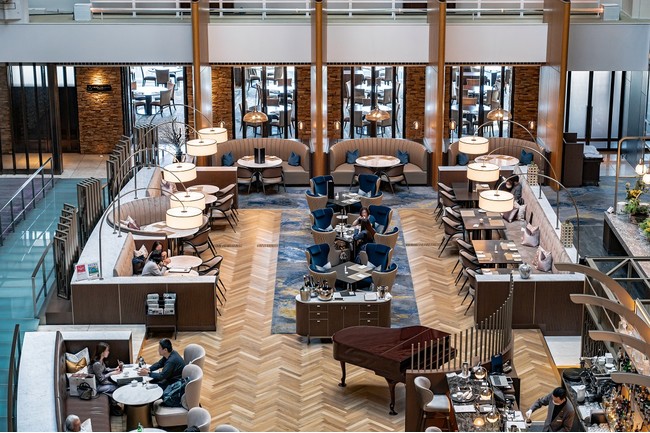 イタリアングリル「メロディア」は、音楽の要素である“メロディ”をイメージした温かみのあるデザインで、しつらえには音符や五線紙などがいたるところに散りばめられています。6層分の吹き抜けの開放的なアトリウムは、朝は爽やかな陽射しが差し込み、夜はキャンドルライトがきらめく心地よい空間に。長さ26メートルのガラスブリッジが美しく光を反射します。ブレックファストからランチ、ディナーと旬の食材を最大限に活かしたアートのようなプレゼンテーションで優雅な時間を演出します。