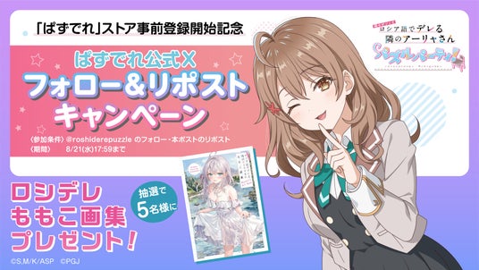 『時々ボソッとロシア語でデレる隣のアーリャさん パズルパーティ!』(略称:ぱずでれ)はストア事前登録開始記念として、本日2024年8月15日(木)より7日間、公式Xにてフォロー&リポストキャンペーンを実施します。本キャンペーンの報酬は、ライトノベル『時々ボソッとロシア語でデレる隣のアーリャさん』のイラストを担当するももこ氏の画集を5名様にプレゼントいたします。