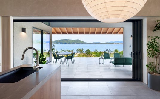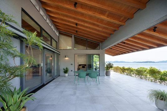 存在感のある大屋根によって作り出された3mもの軒下空間および、柱の無い20帖を超えるテラスと屋内外とのつながりを大切にした空間を特徴とし、部屋のどこにいても糸島の海の絶景を堪能することができます。日ごろの喧騒から離れ、刻一刻と変わる海の表情を楽しみながら過ごす、自然と調和する非日常の暮らしを味わうことができます。