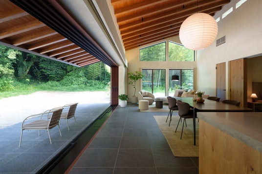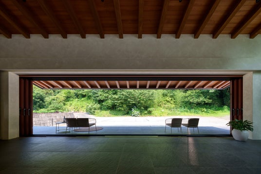 西原の大自然の中に佇み、目の前に広がる大自然をまるで切り取るかのように存在する約8メートルの大開口と大空間を特徴とし、深緑の森、光と風に包まれながら心と体を癒す贅沢で自由な暮らしを堪能することができます。