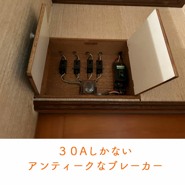 そのため、エアコンをつけようとしても、基本的な家の電力が足りないため、中部電力と新たに契約をし、外の電柱から太いケーブルを引っ張ってきて電力を上げるという電気配線の工事が必須です。