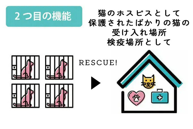 このシェルターは、猫たちを救う拠点として、そして、より多くの方々が猫助けにかかわれるきっかけとなる拠点にしていきたいと考えています。