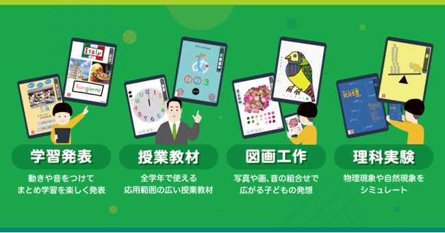 従来はノートや模造紙などの紙にまとめていた社会のまとめ学習、観察日記、理科実験の結果、図画工作での作品づくりなどを、プログラミングもしながらデジタル作品として自由自在に表現することができ、教科の学びを深めるのに役立ちます。