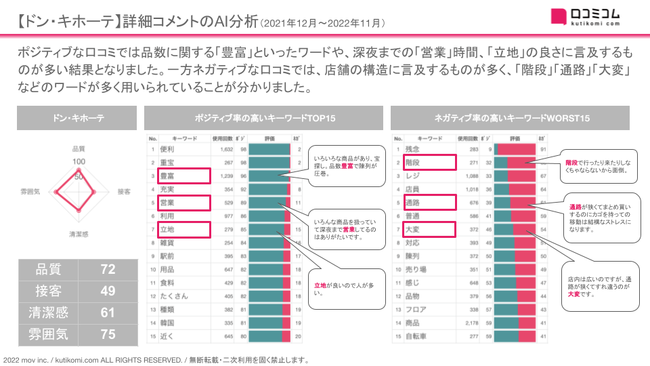 ・ドン・キホーテは「立地」や営業「時間」で多くのポジティブな口コミを得ていること