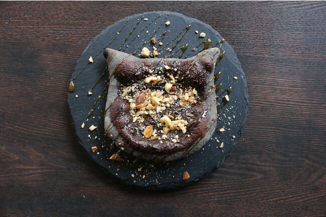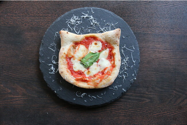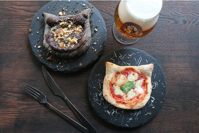 石臼挽き小麦を使用した当店オリジナル生地を猫型に成型し、トマトソース・モッツアレラチーズ・バジルをのせて焼き上げた「“にゃ”ルゲリータ」と、黒猫をイメージしてココアで黒く色付けした猫型生地にチョコレートソースを塗って焼いたデザートピザ「チョコ“にゃ”ッツ」の2種類がセットになっています。