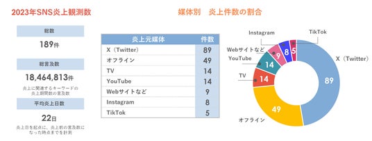 2023年のSNS炎上総数は「189件」、炎上元の媒体1位は「X」、2位「オフライン」
