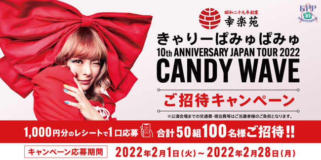 「New Happy 5箇条」の策定や、ワクワクチャンネルでの「幸楽苑Happy STYLE」のナビゲーターとしての活動など、日頃より幸楽苑とともにらーめんを通して”しあわせ”をお届けしてまいりました。そんな、きゃりーぱみゅぱみゅさんのデビュー10周年というメモリアルなライブツアー きゃりーぱみゅぱみゅ10th ANNIVERSARY TOUR2022「CANDY WAVE」の中から、幸楽苑店舗のある10の地域に抽選で合計50組100名の方をご招待させていただきます。らーめんを食べてみんなできゃりーぱみゅぱみゅさんのライブに行きましょう!