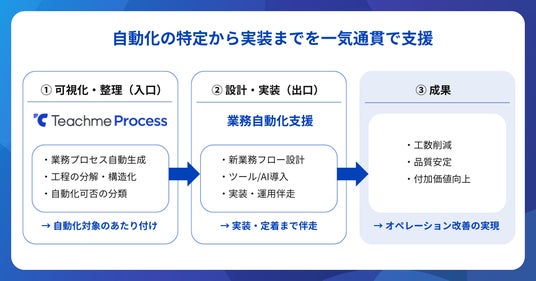 Teachme Processで業務の全体像を可視化・整理したうえで、業務自動化支援で新業務フローの設計・実装へと移行することで、「どこを自動化するか」と「どう自動化するか」をセットで進めることができます。入口(可視化・整理)と出口(実装・伴走)を組み合わせることで、より実効性の高いオペレーション改善を実現します。