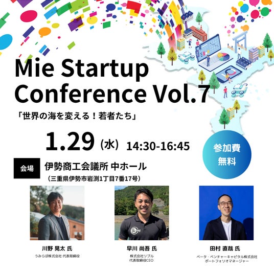 昨年より三重県が開催している「みえスタートアップカンファレンス」は七回目で、伊勢市にて開催します。今回は海に関わる三重県内外のスタートアップ2社の経営者が登壇します。