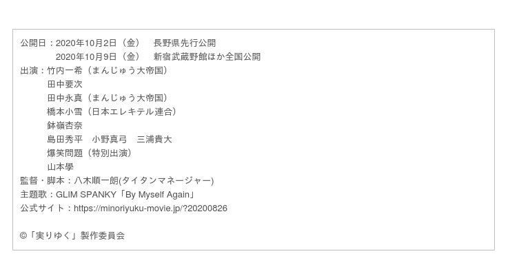 その後、主演・竹内一希×八木順一朗監督の再タッグで映画撮影が長野県で開始され、田中要次、三浦貴大、小野真弓、山本學など日本映画を代表する俳優陣も集結!さらに島田秀平や爆笑問題が本人役として特別出演し、可笑しくも深みのある人間模様が楽しめる作品として映画『実りゆく』は完成した。