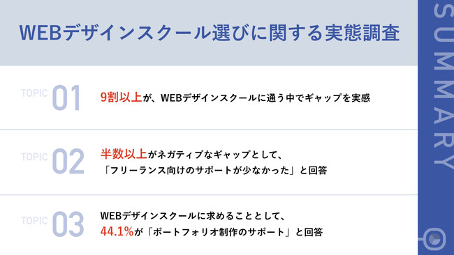 コロナ禍を機にキャリアや働き方への意識が変化する中で、手に職を求めたりフリーランスとしての働き方を考える人が増えています。また、WEBデザインスクールへの関心が高まりをみせており、実際にWEBデザインスクールに通った経験を持つ人からも、効率よくスキルを習得することを目的にする人が多いことが分かりました。